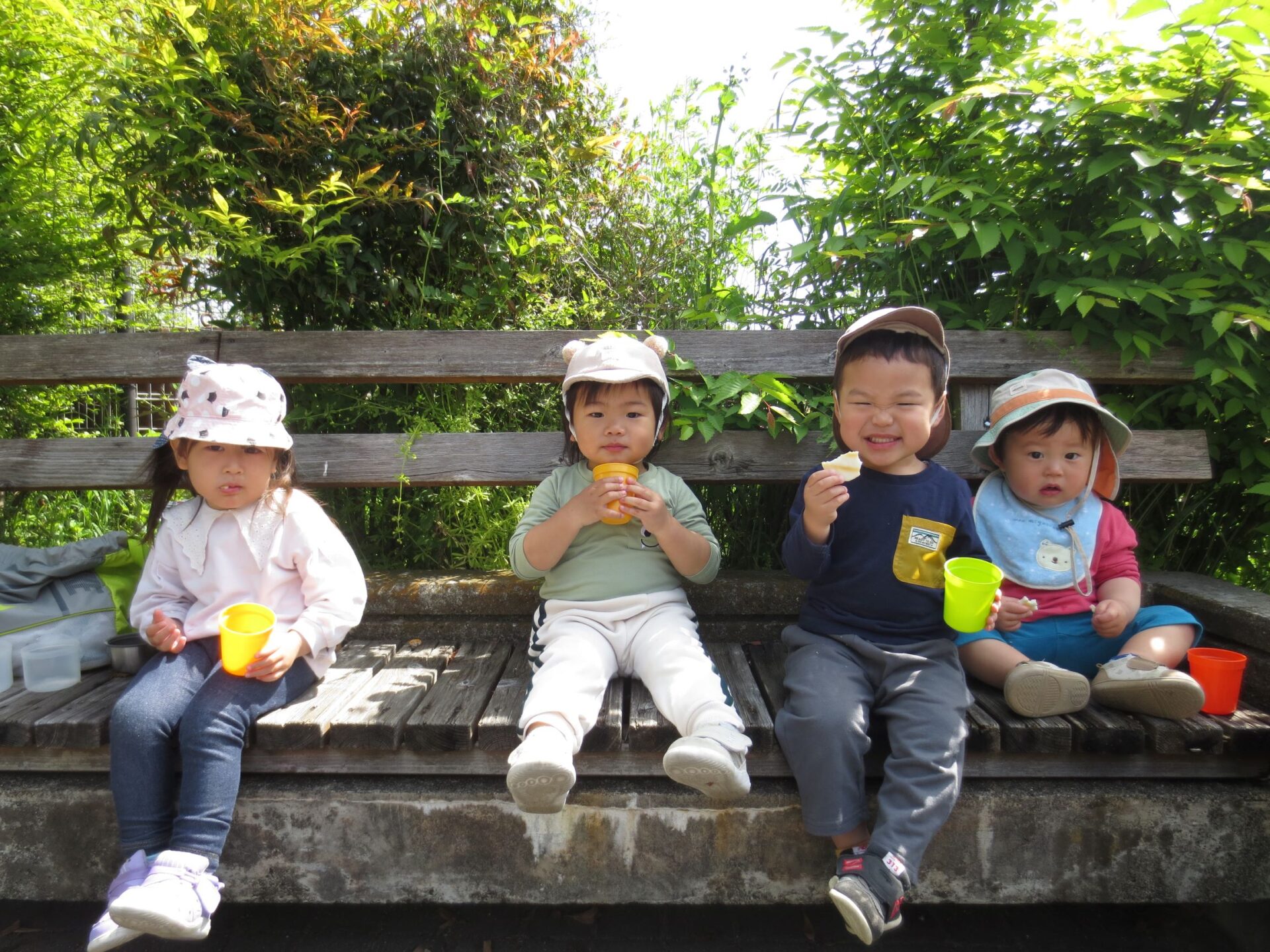 お外で食べるおやつは格別♡みんなで並んで食べました!お日さまの下でみんなで食べると、とっても美味しいね。