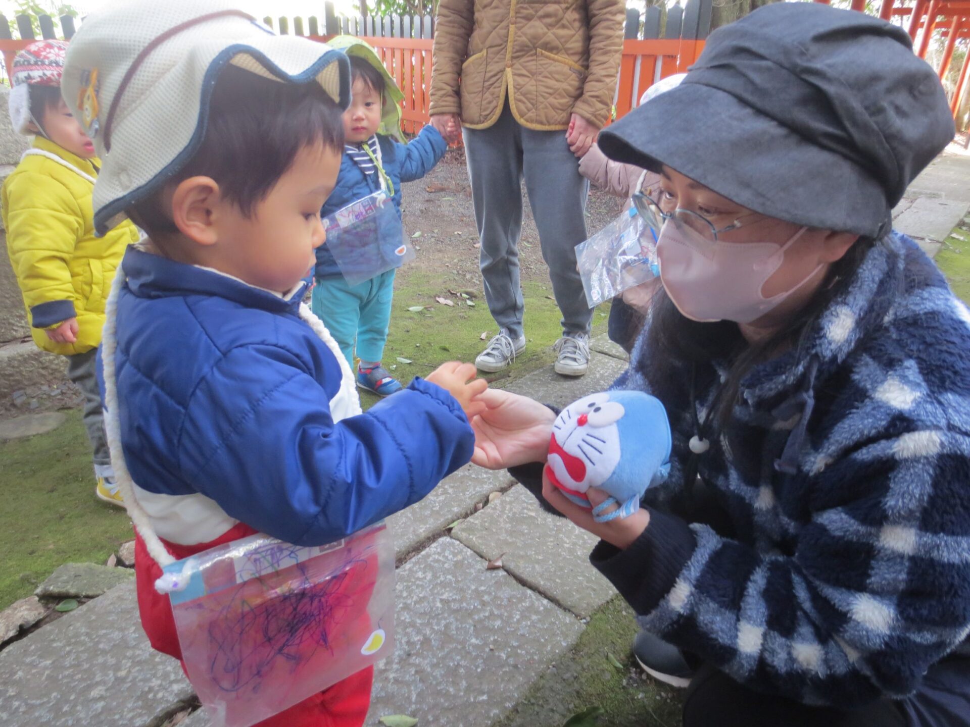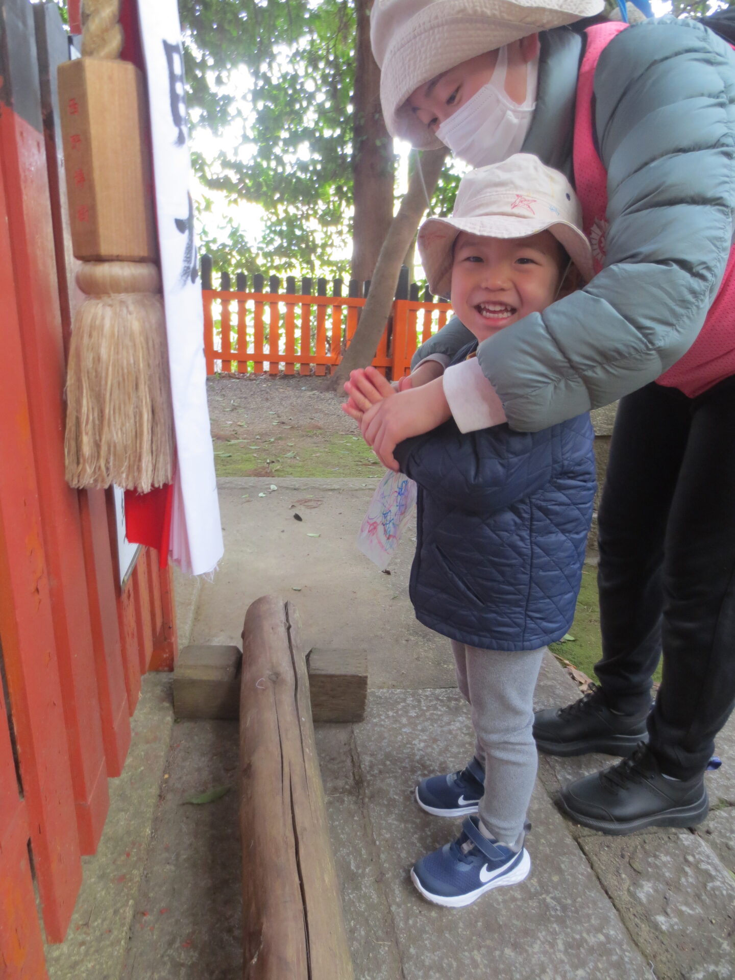 園長先生にお賽銭をもらい、賽銭箱に入れてお詣りしました。