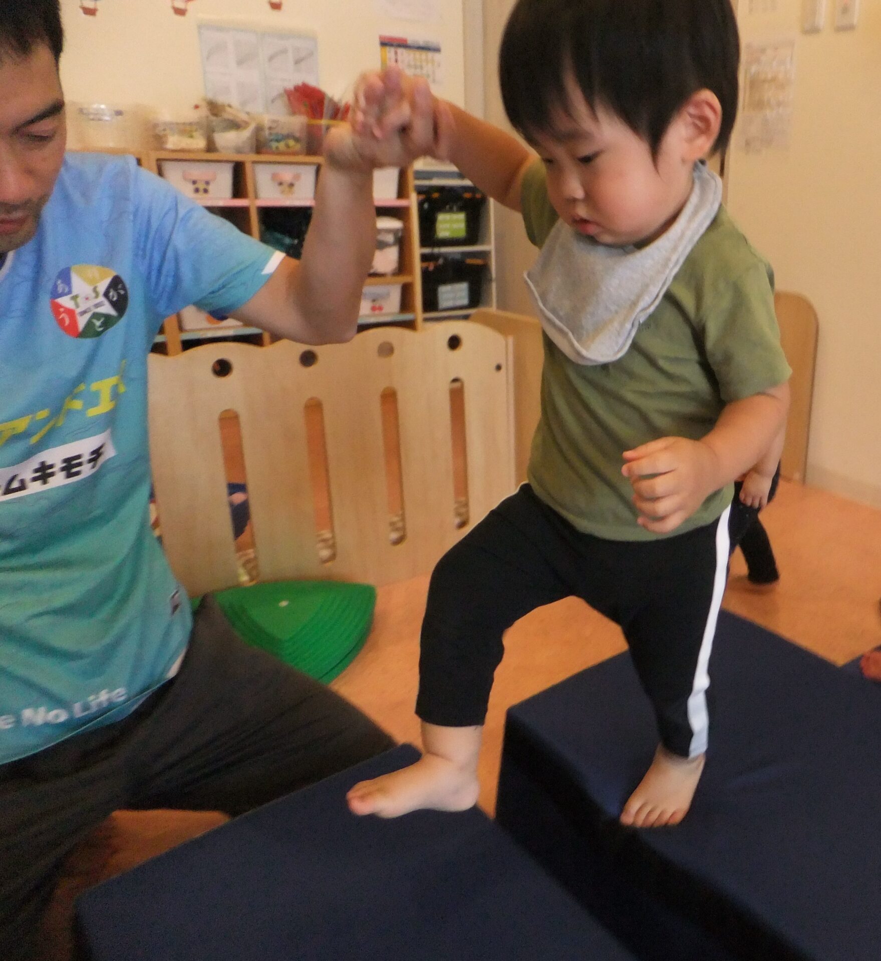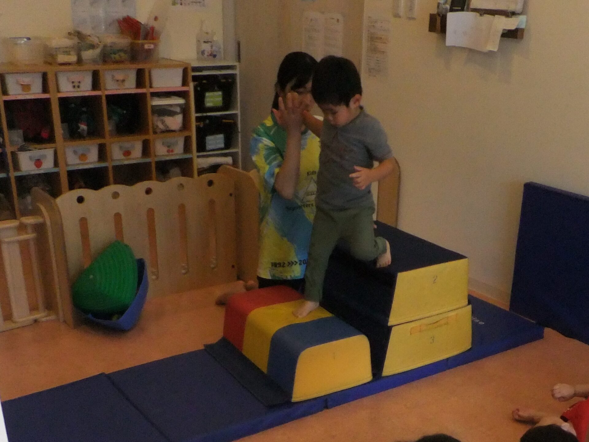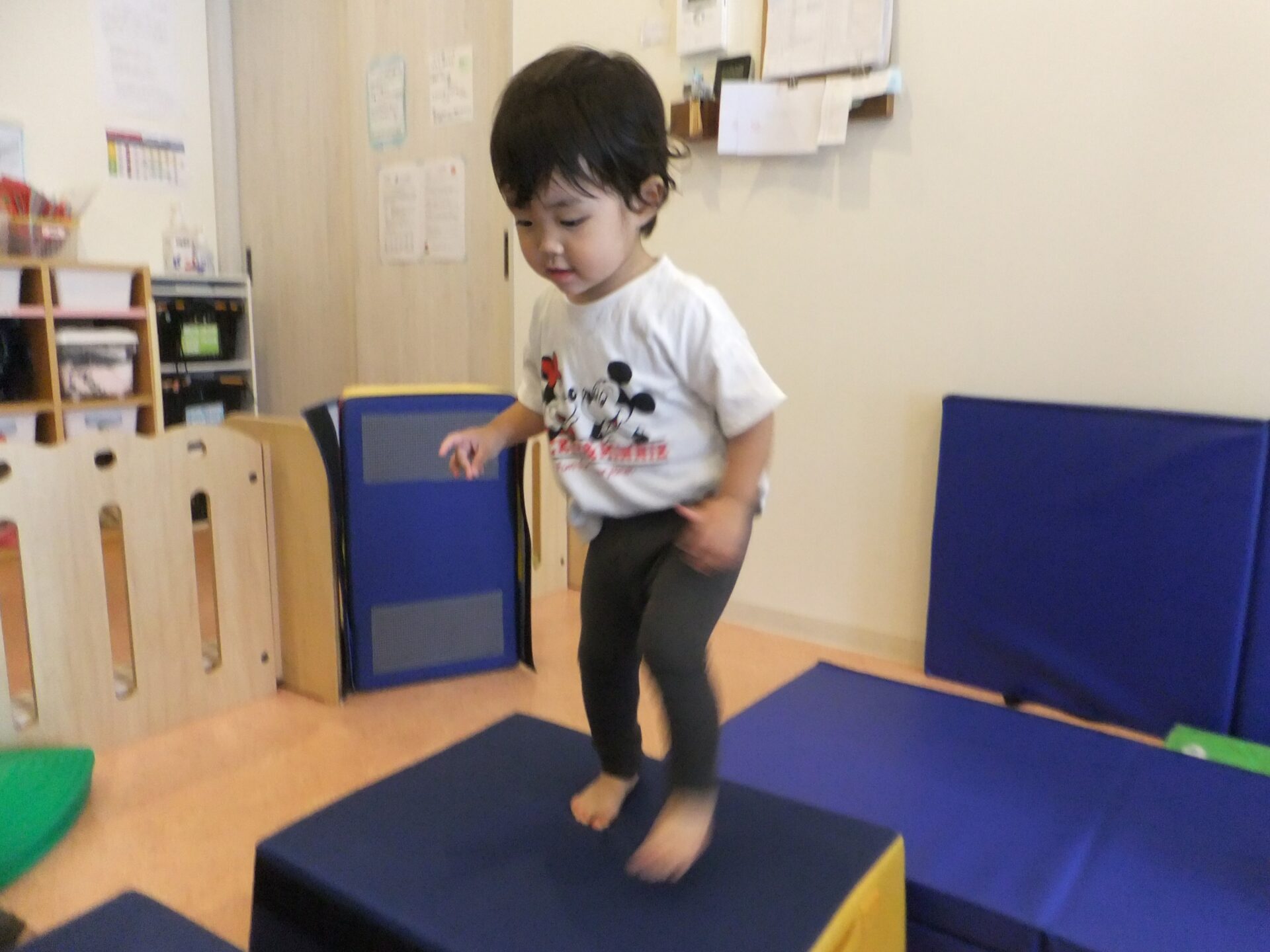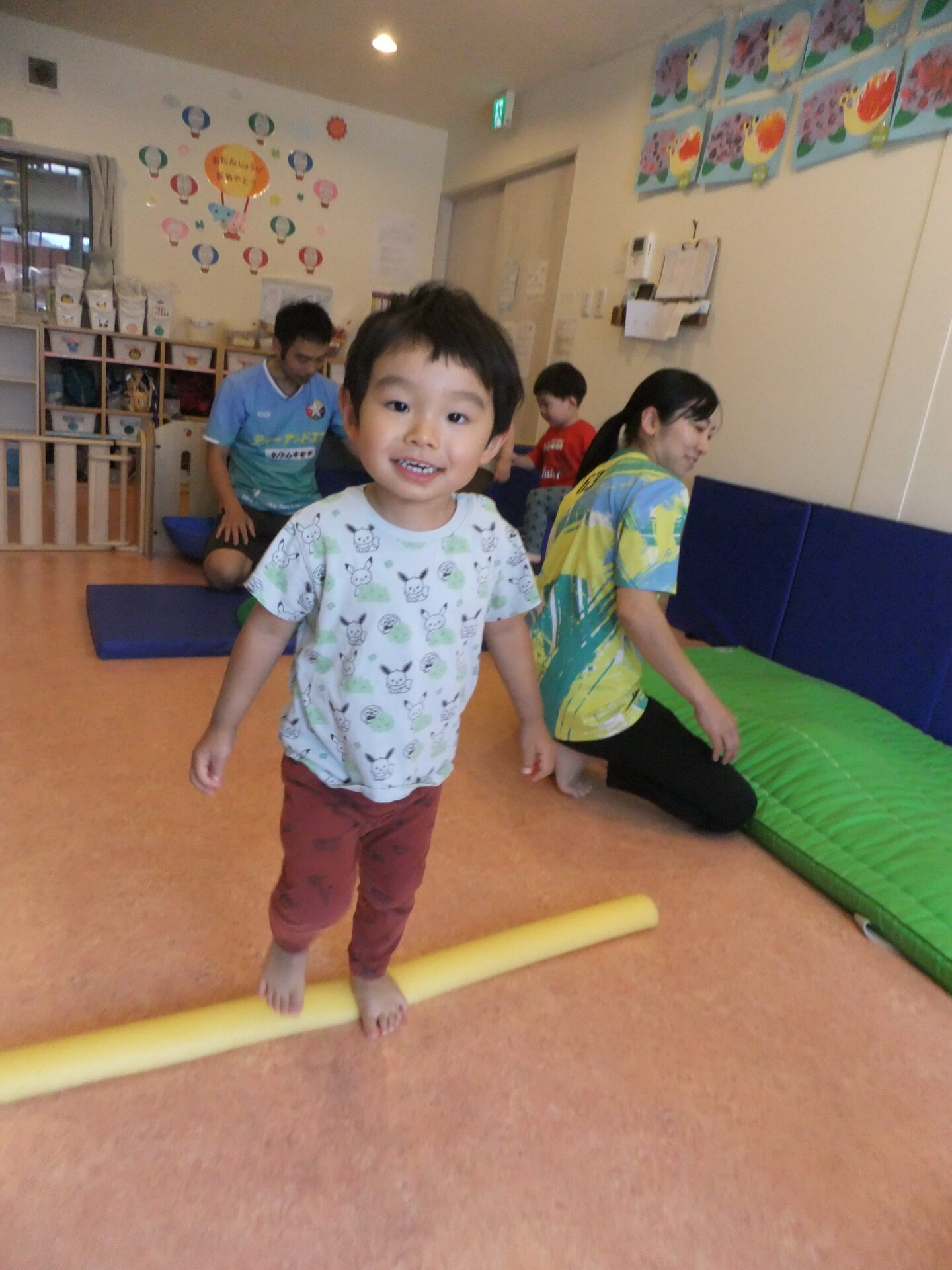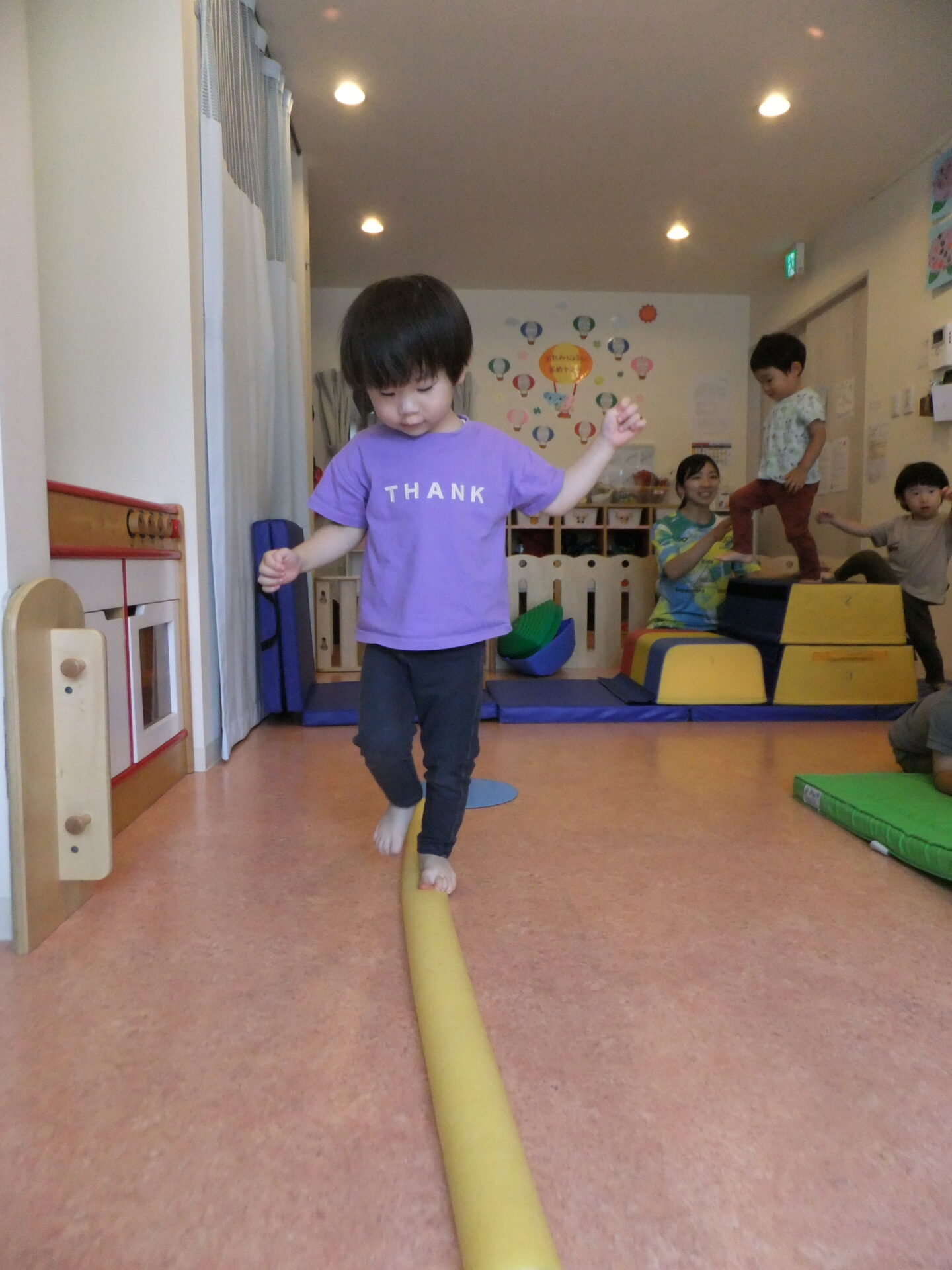 段差の上り下りを全身を使って挑戦したり、細いスポンジポールの上を落ちないように両手を広げてバランスを取って渡ったり・・・とのびのびと取り組んでいました。