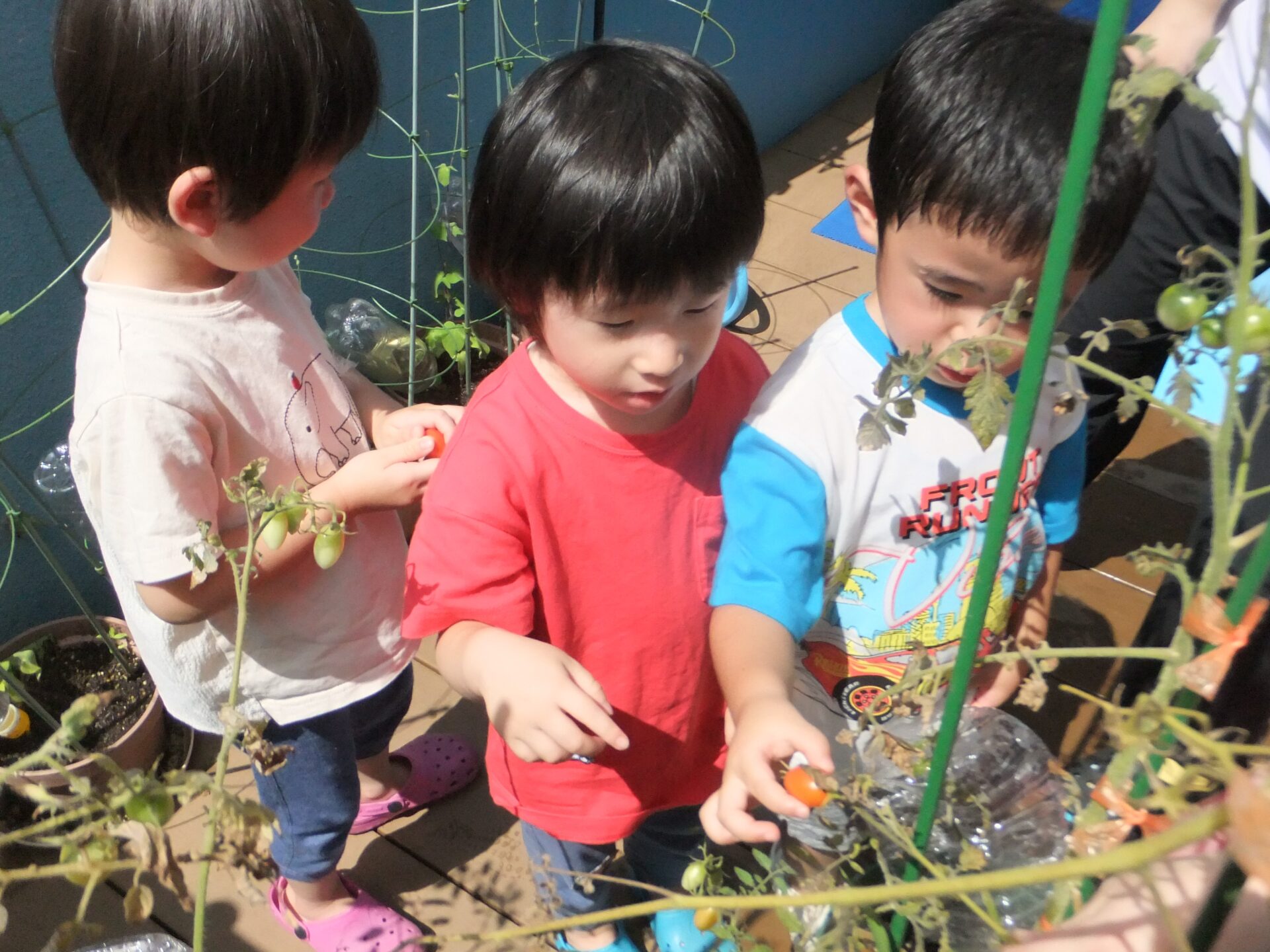 「赤くなってるのはどれかな?」「ここにある!」等と子どもたち自身で探して採ることができるようになっていて、無事に収穫できるととても嬉しそうにしています🎶