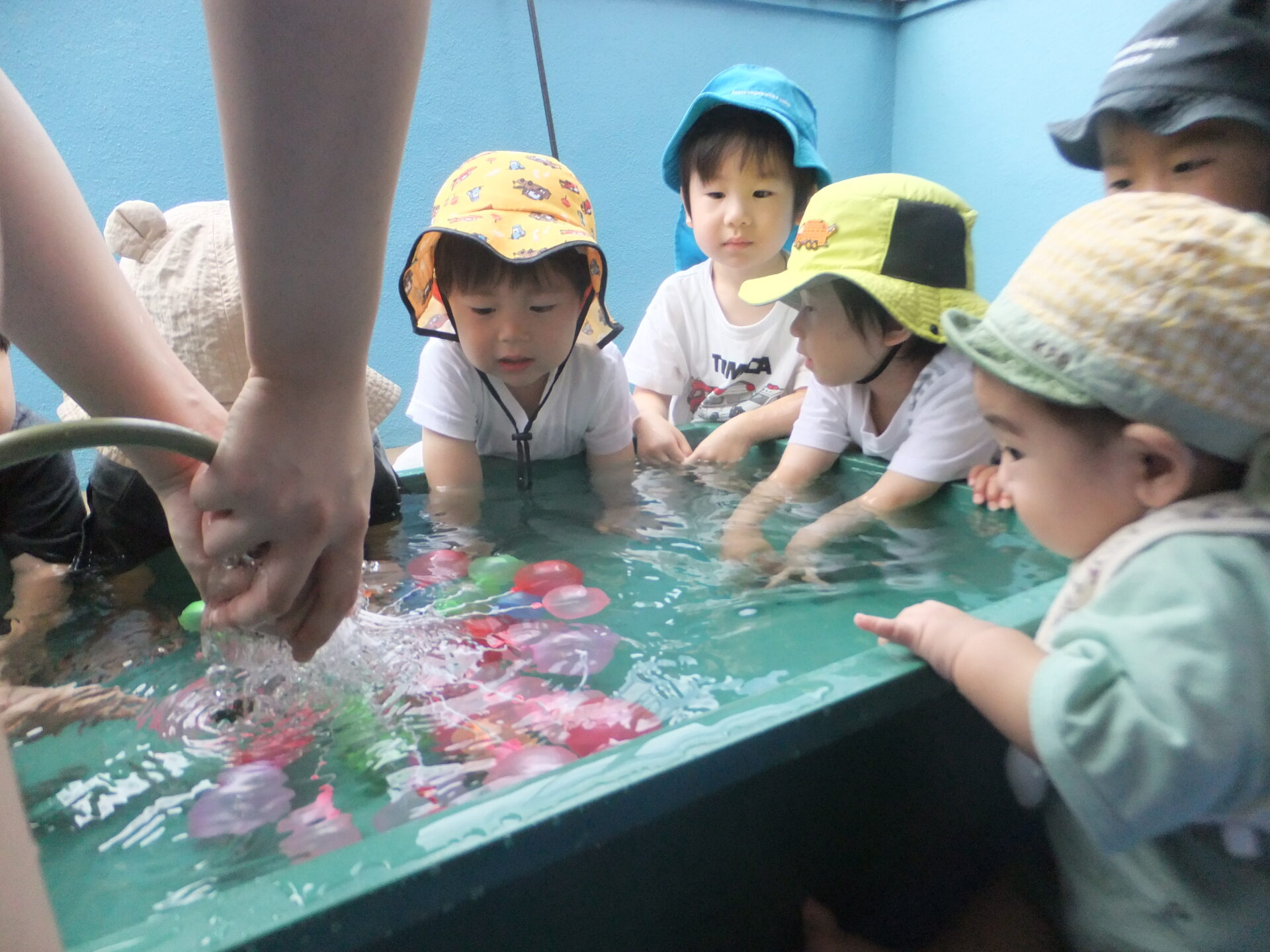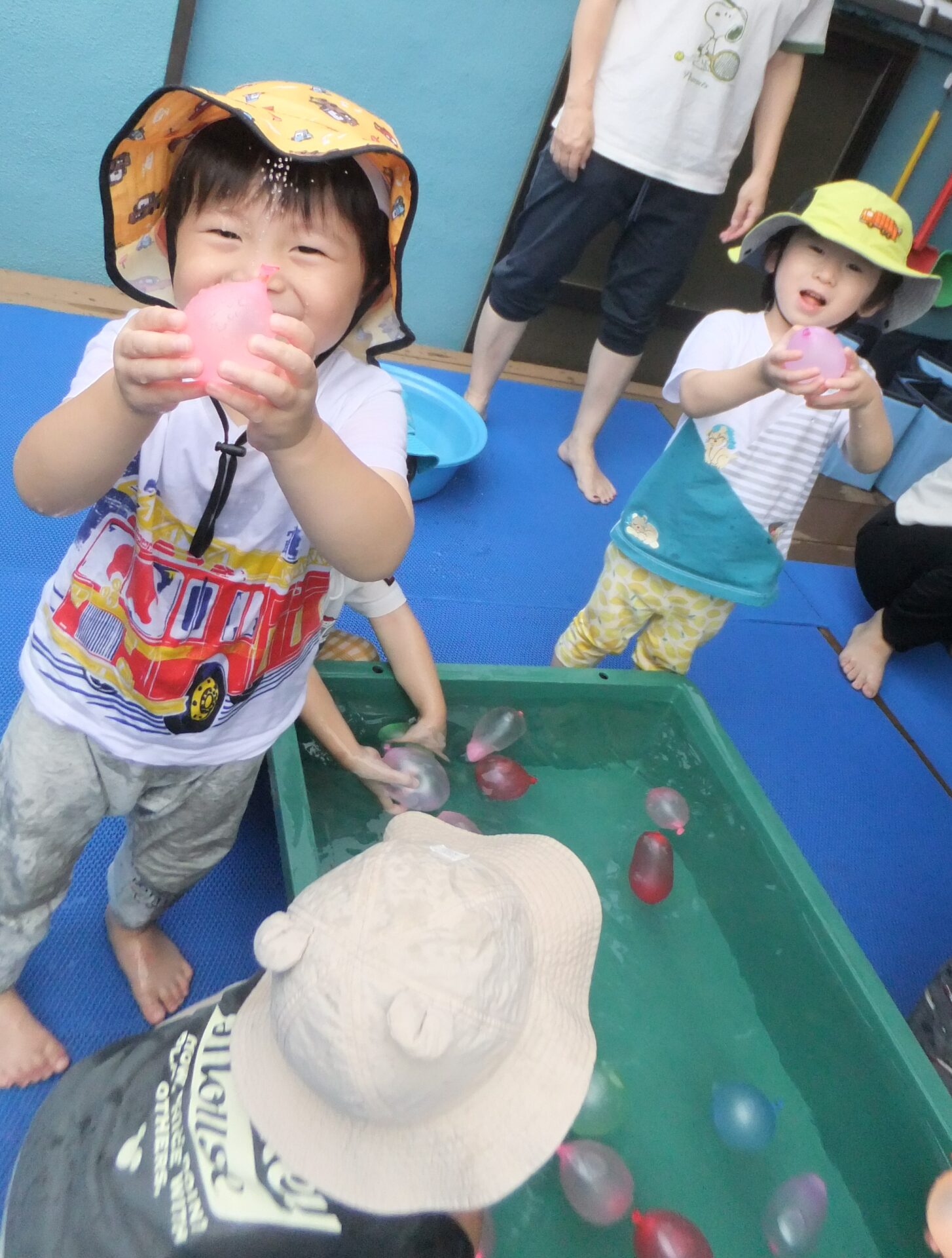 初めは小さくてしぼんでいますが、水が入って少しずつ膨らんでいく水風船にみんなで釘付けで、目をキラキラと輝かせたり”早く触りたい”と手を伸ばしたりと待ちきれない様子でした😲