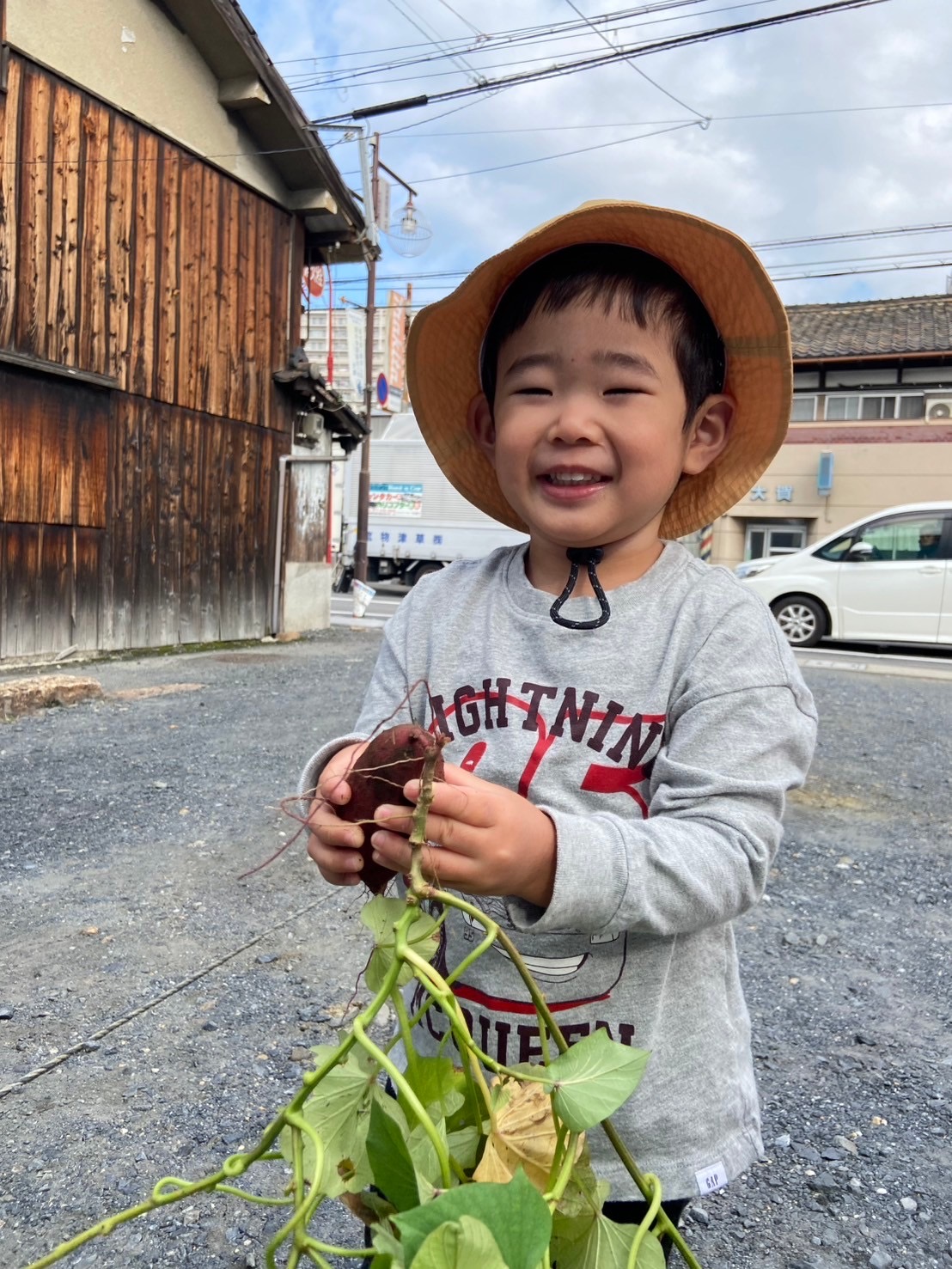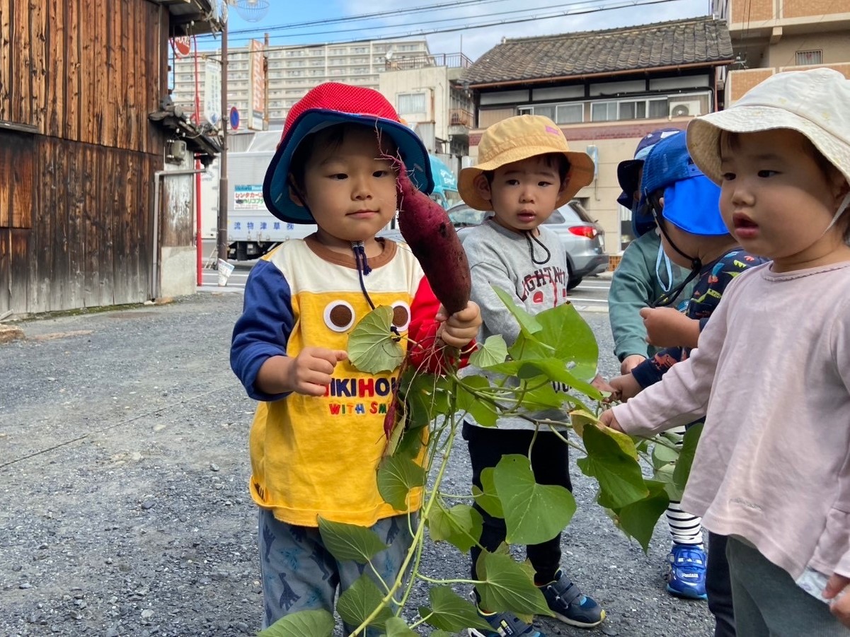 さつまいもを手にすると「わー!大きいね!」と大きさや重さにびっくりしつつ、友だちや保育者と顔を見合わせて嬉しそうにしていました。