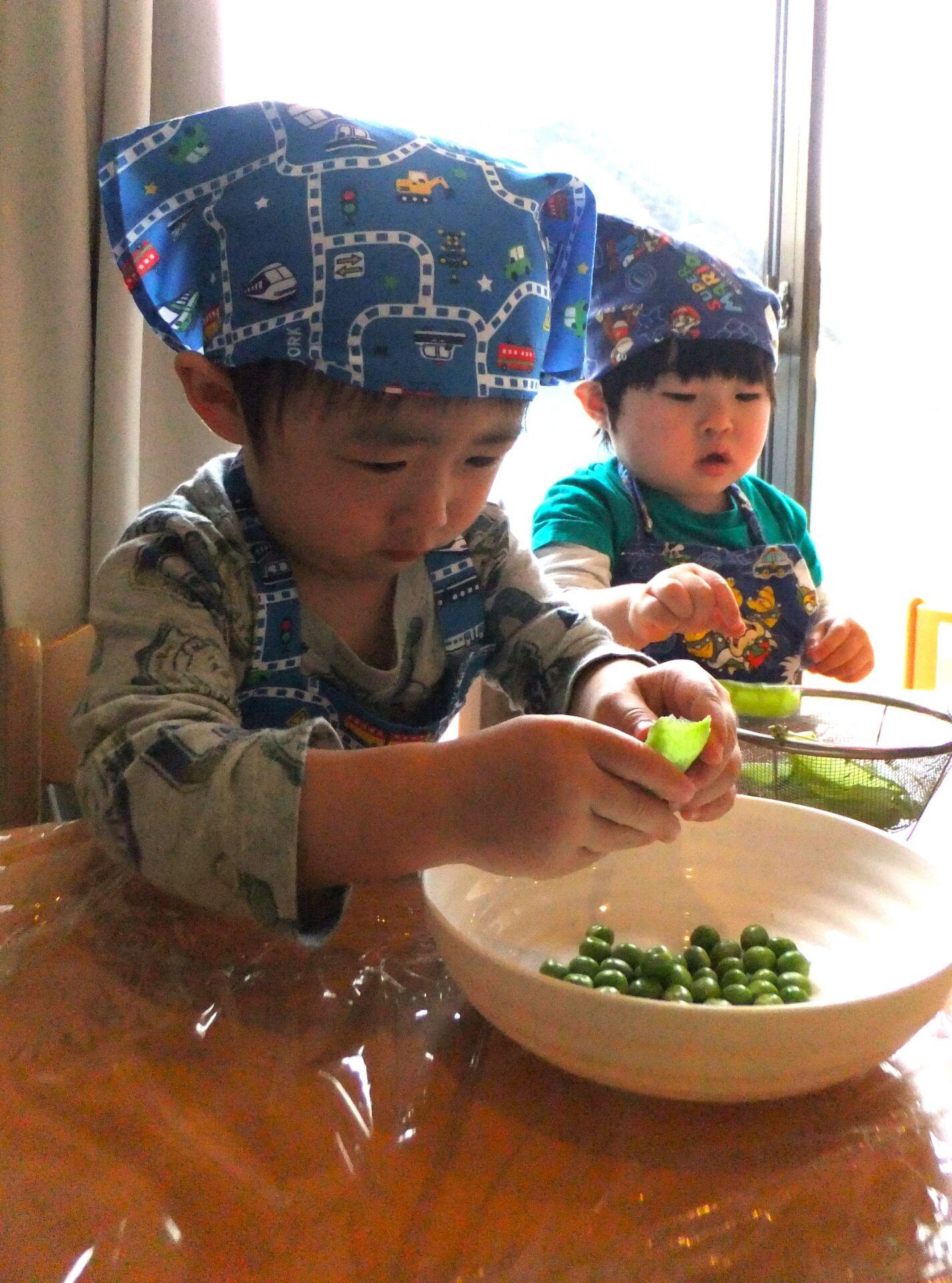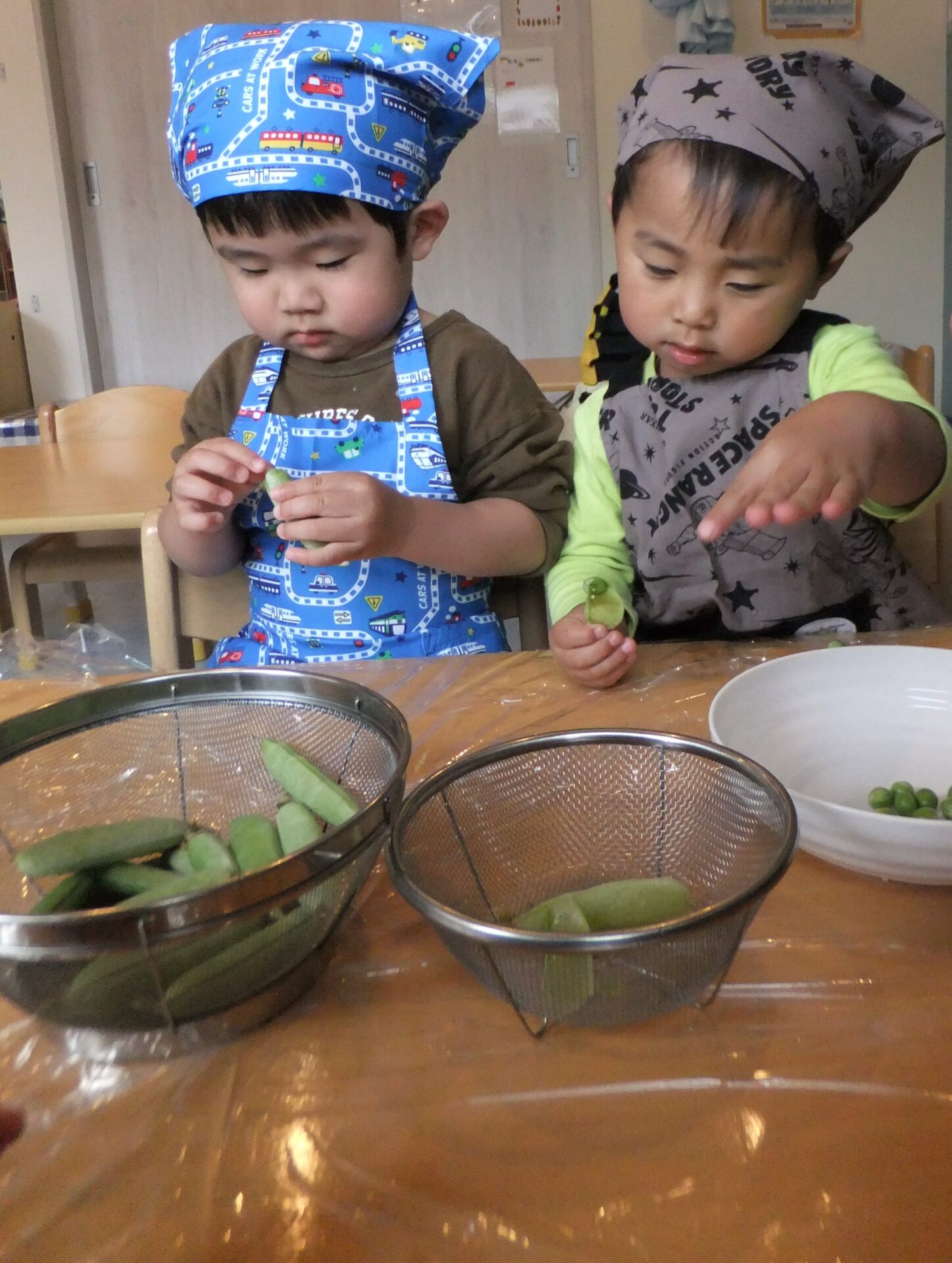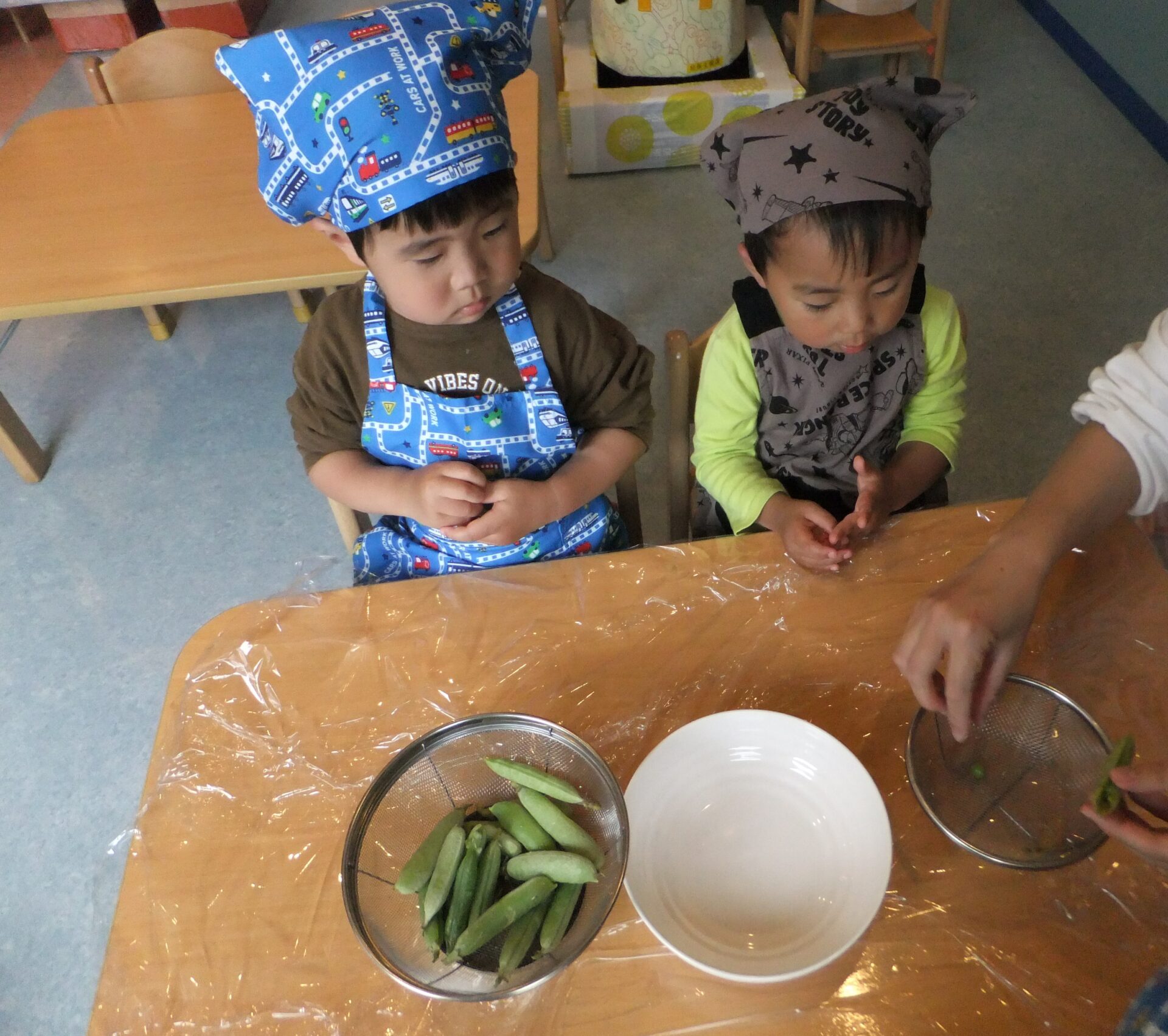 エンドウ豆が目の前に出てくると、興味津々な様子の子どもたち。