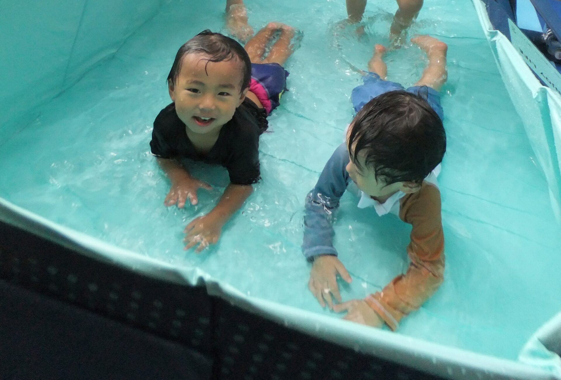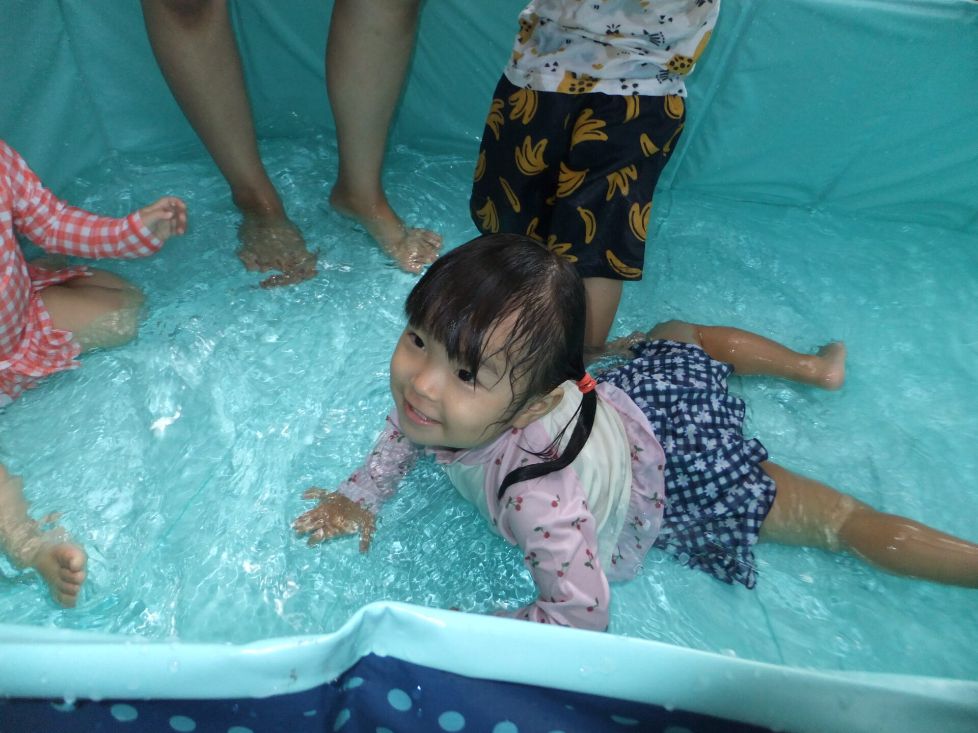 2歳児さんは、「ワニさんだぞ~」と言いながら、プールの中でみんなでワニ歩き🐊