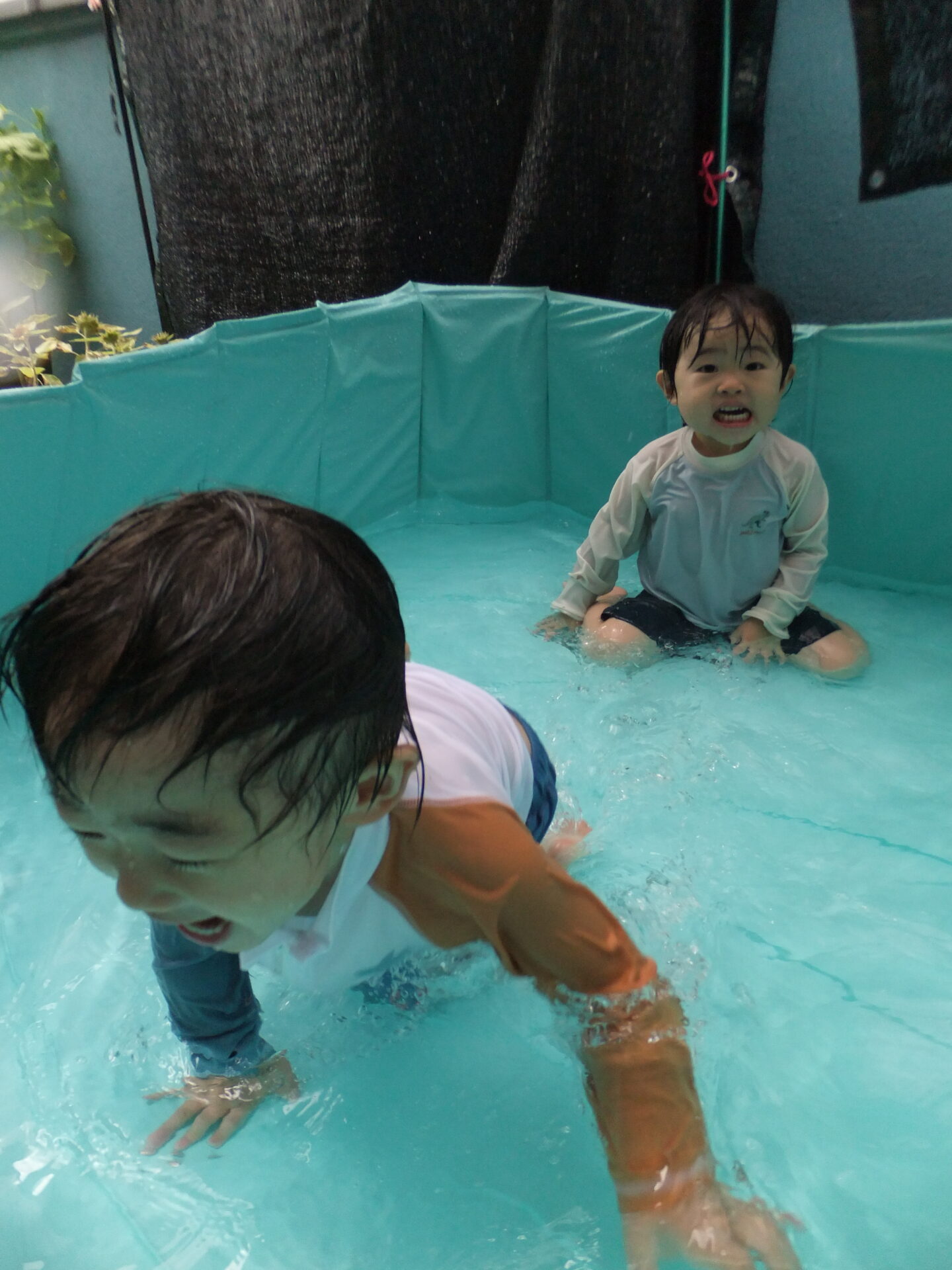 1歳児さんも、水を保育者にかけてみたり、2歳児さんを真似てワニになりきっています♪