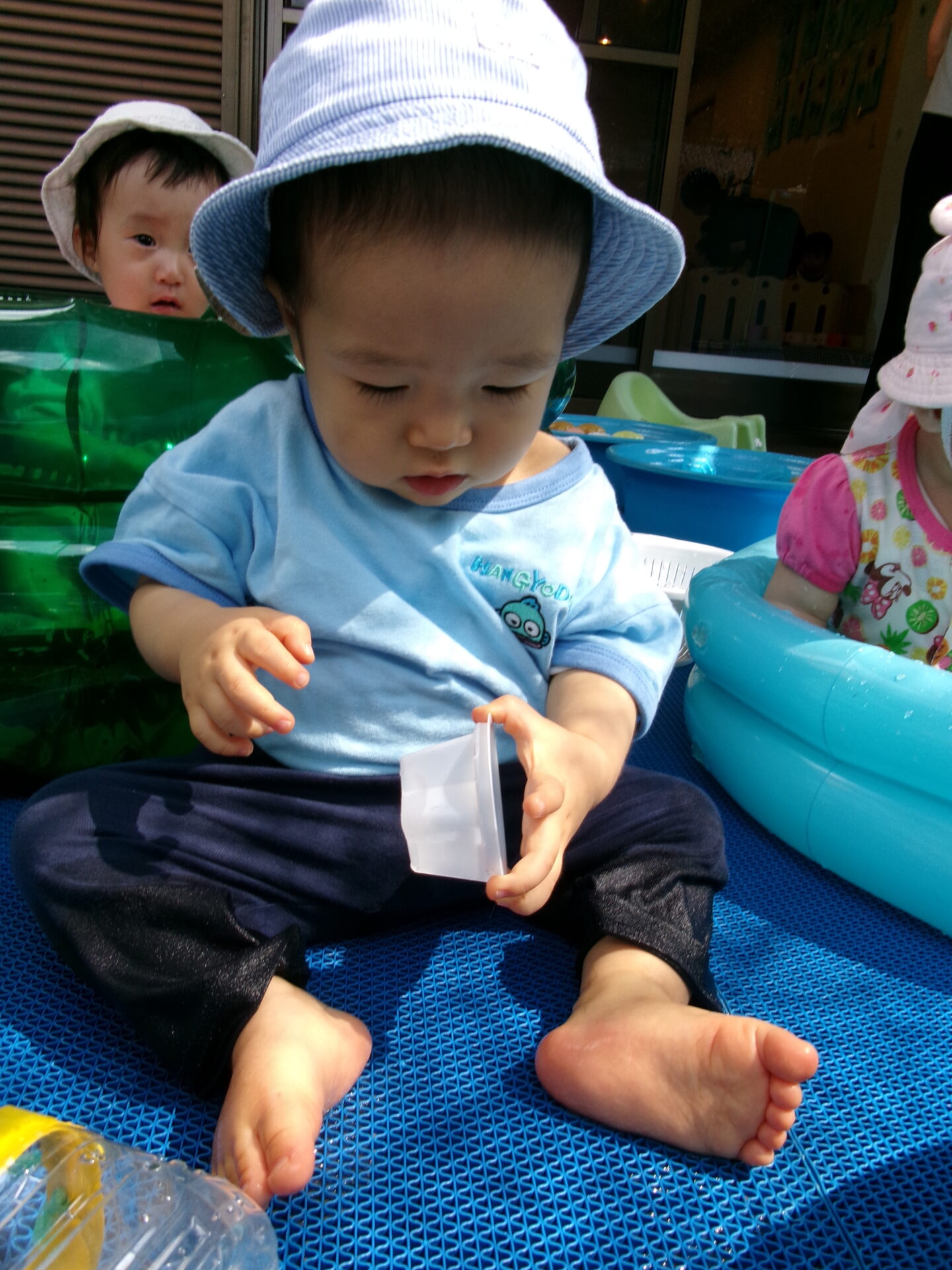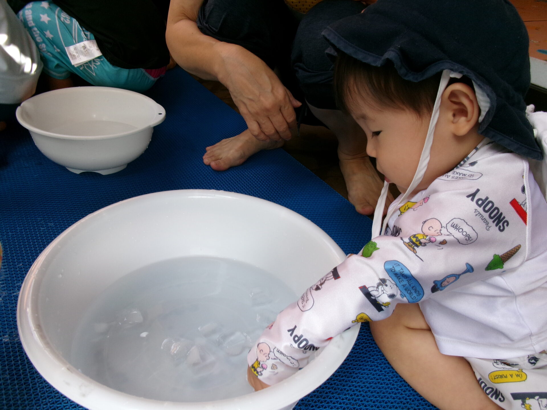 最初は氷の冷たさに驚いていたものの、指先でつんつんと触ってみるうちに、氷に興味を持ち始めた0歳児の子どもたち。