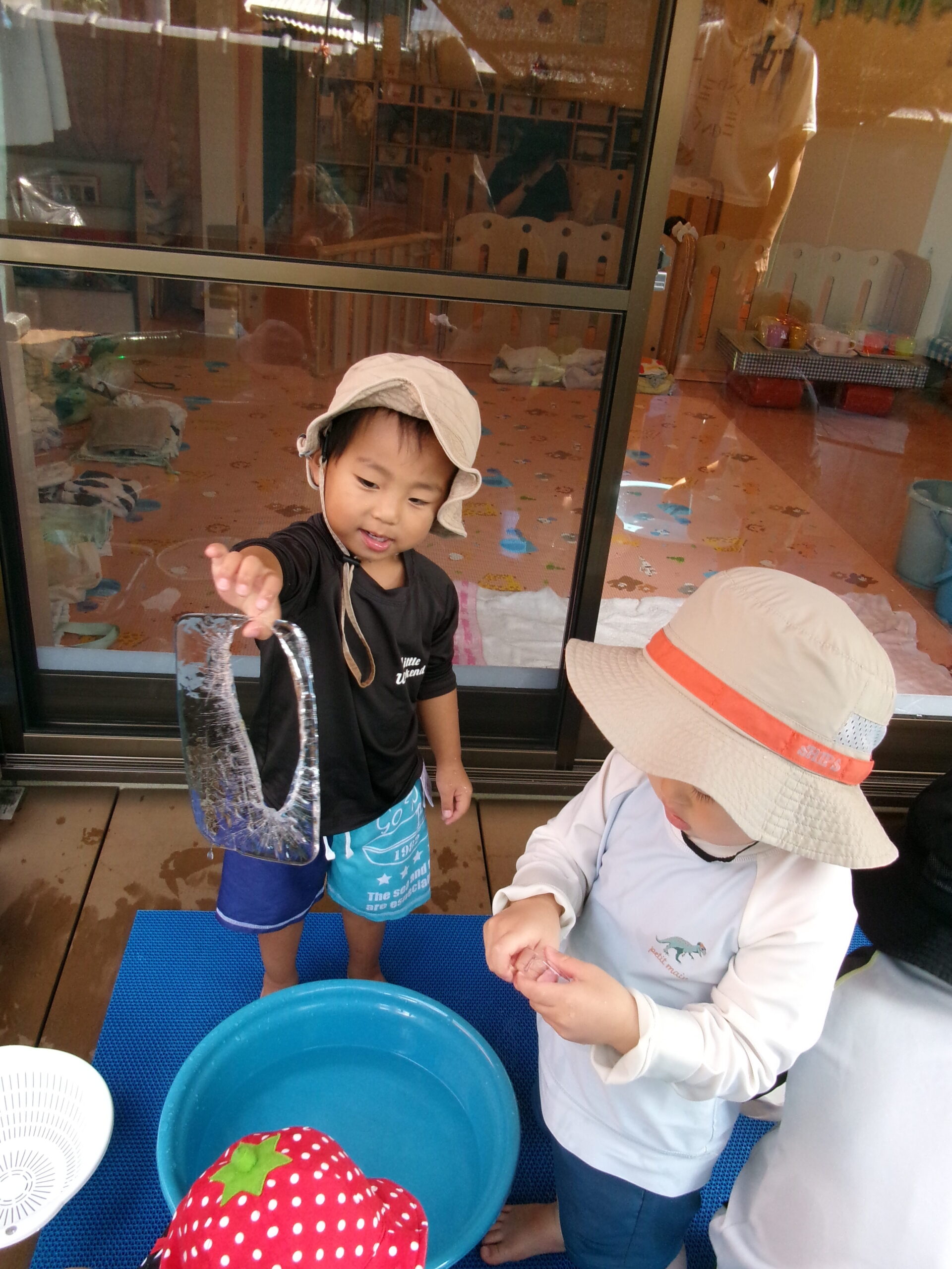 「見て見て!大きい氷、めっちゃ冷たい!」と氷を持ち上げて大喜び。
