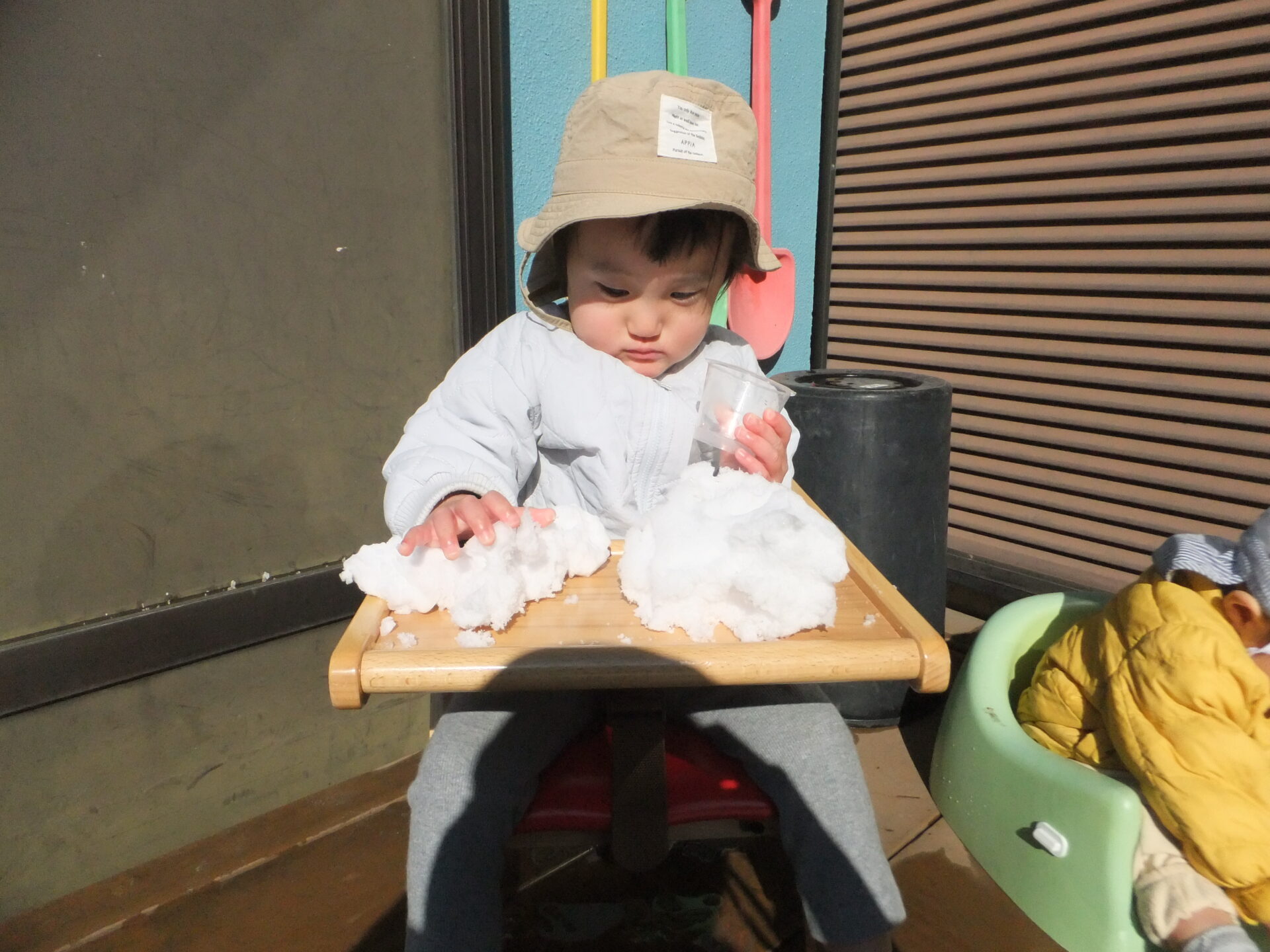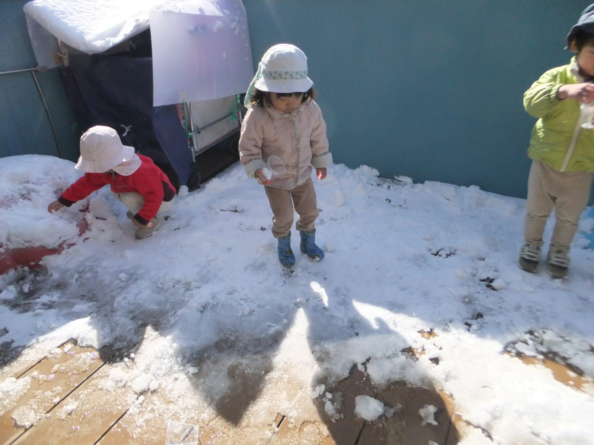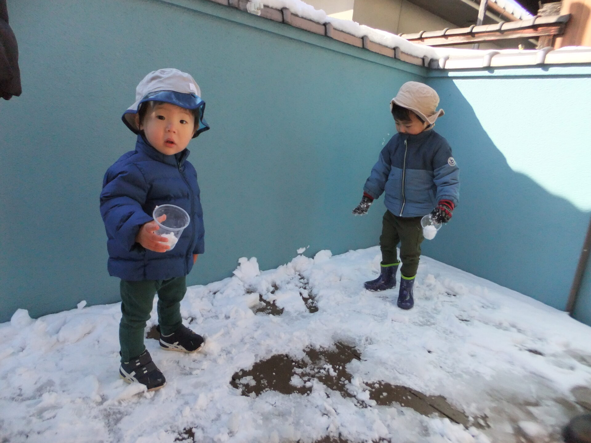 0歳児の子どもたちも、雪の感触を指先で確認した後、手の平で握りしめてみたり、カップに雪を入れて落としてみたりと楽しんでいました💗