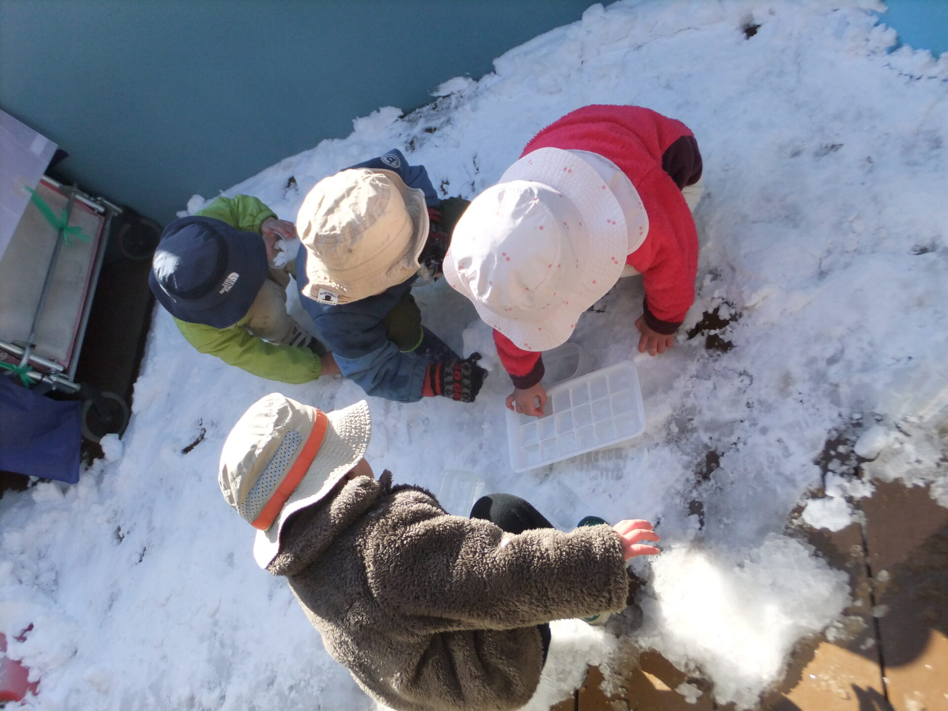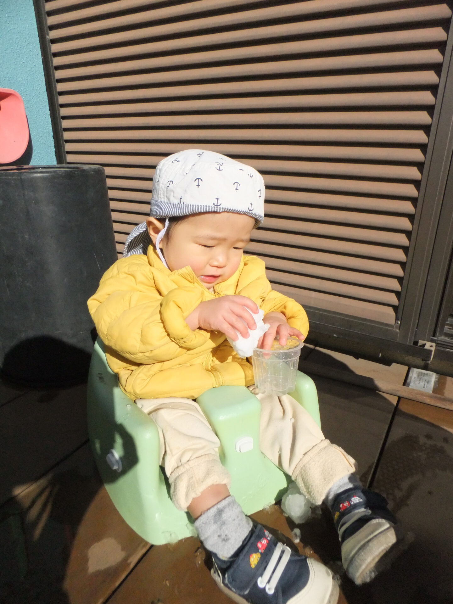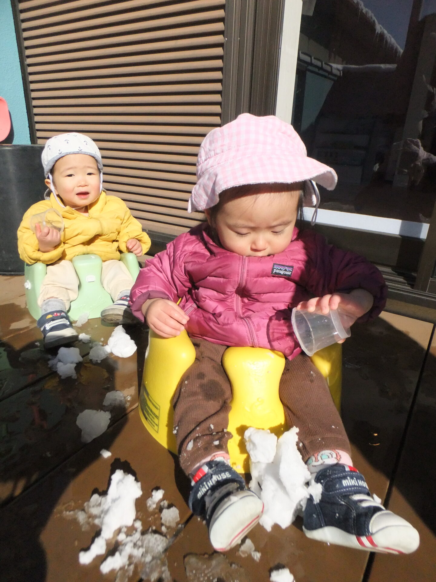 0歳児の子どもたちも、雪の感触を指先で確認した後、手の平で握りしめてみたり、カップに雪を入れて落としてみたりと楽しんでいました💗
