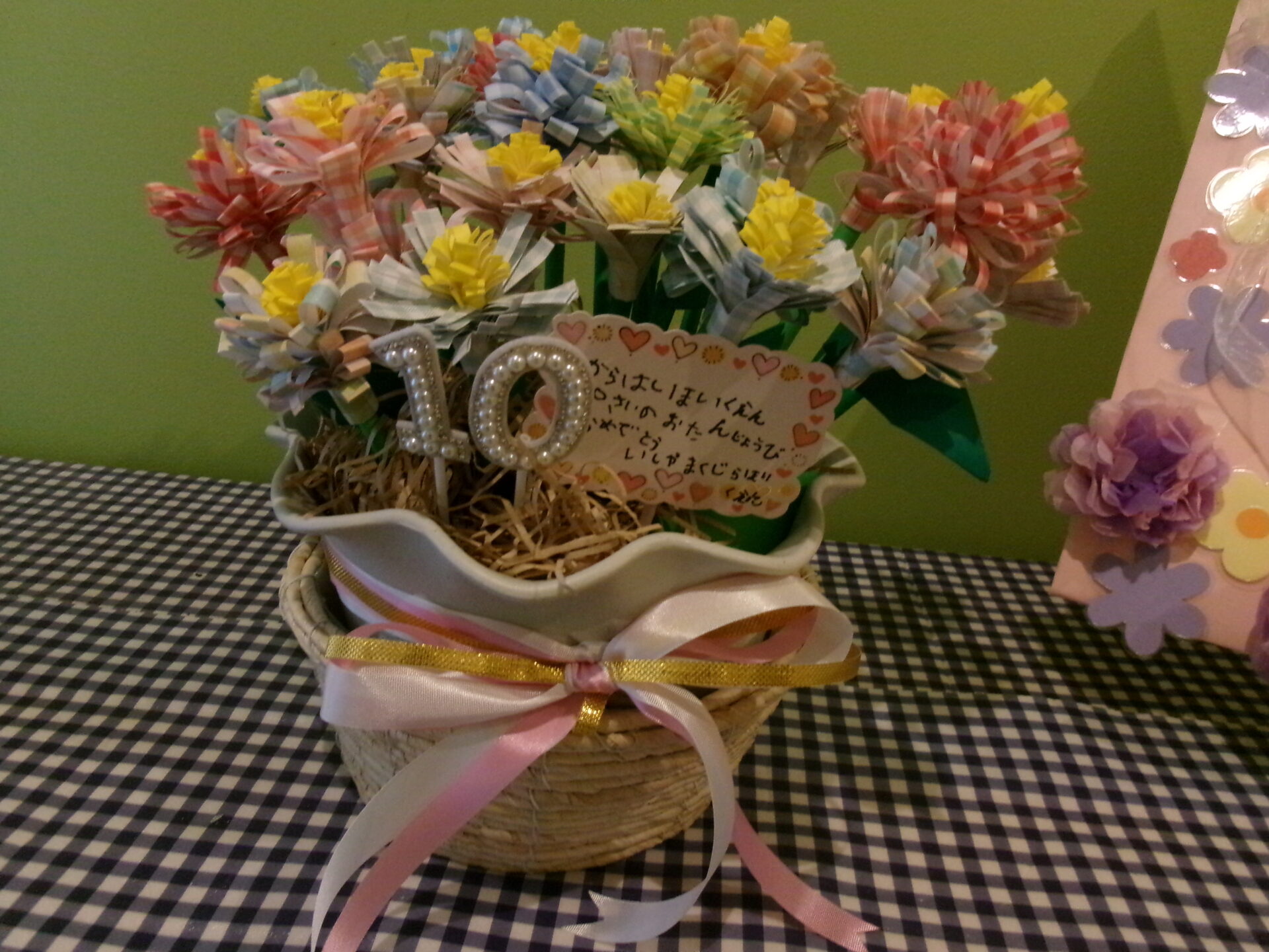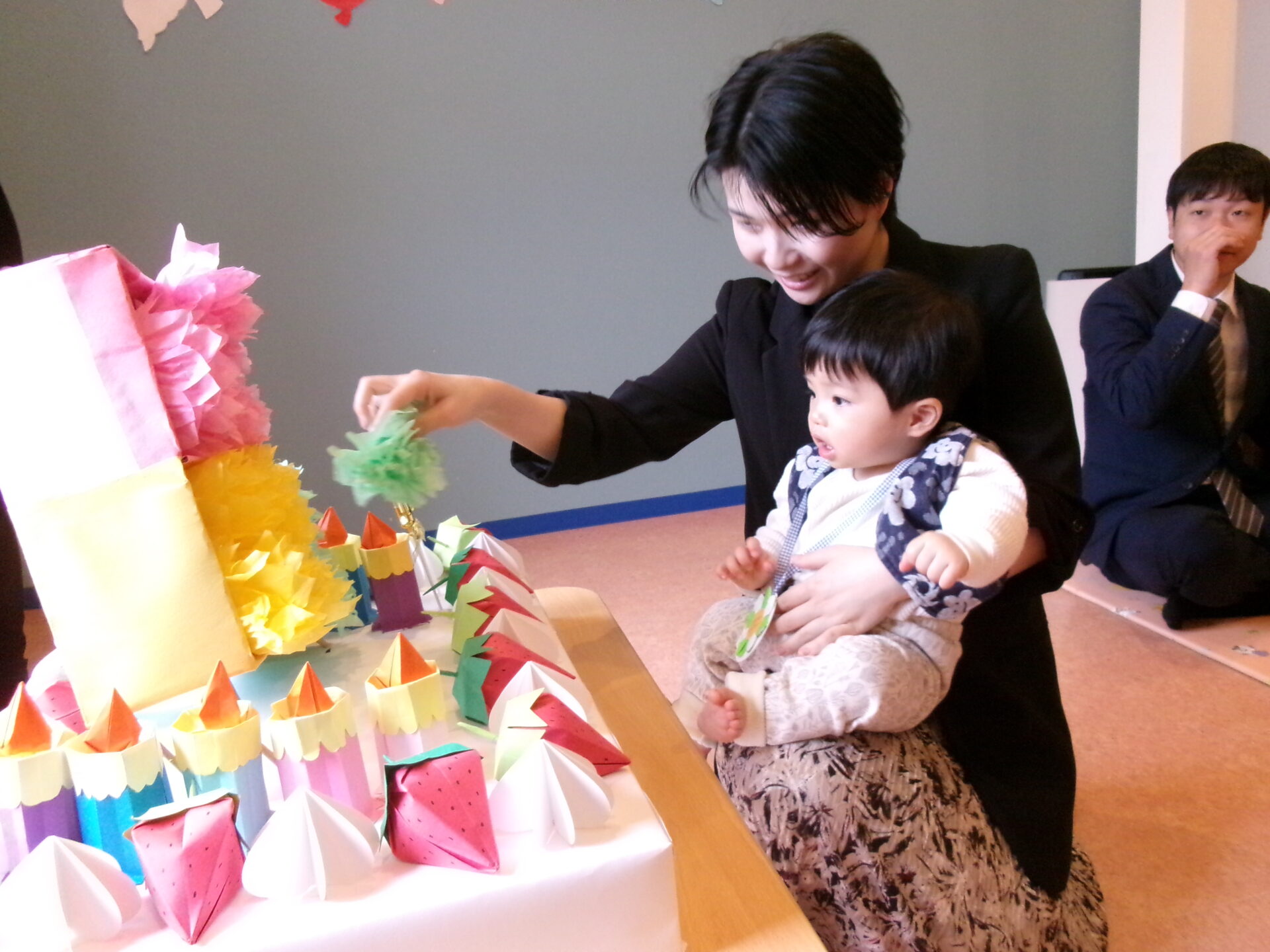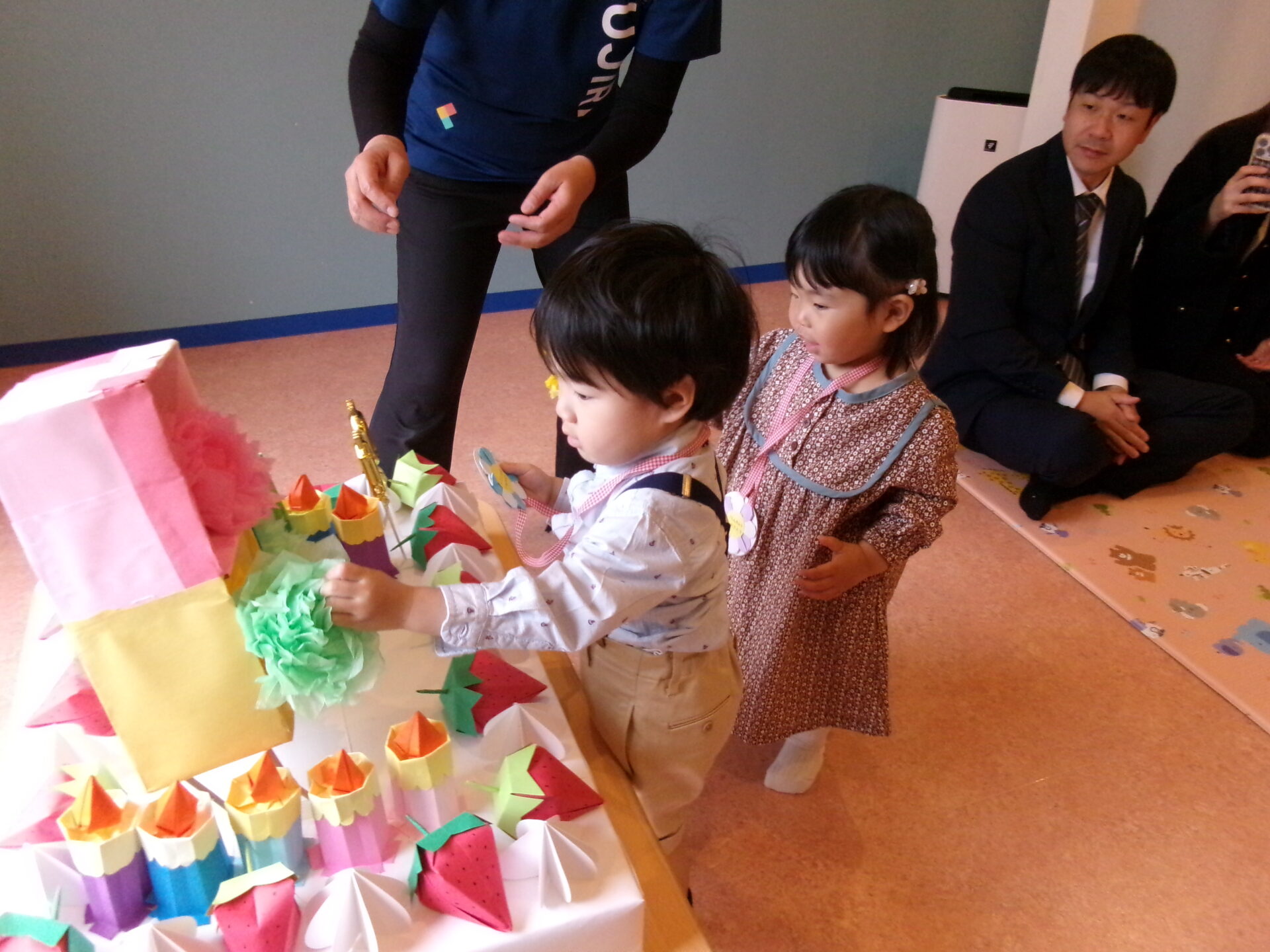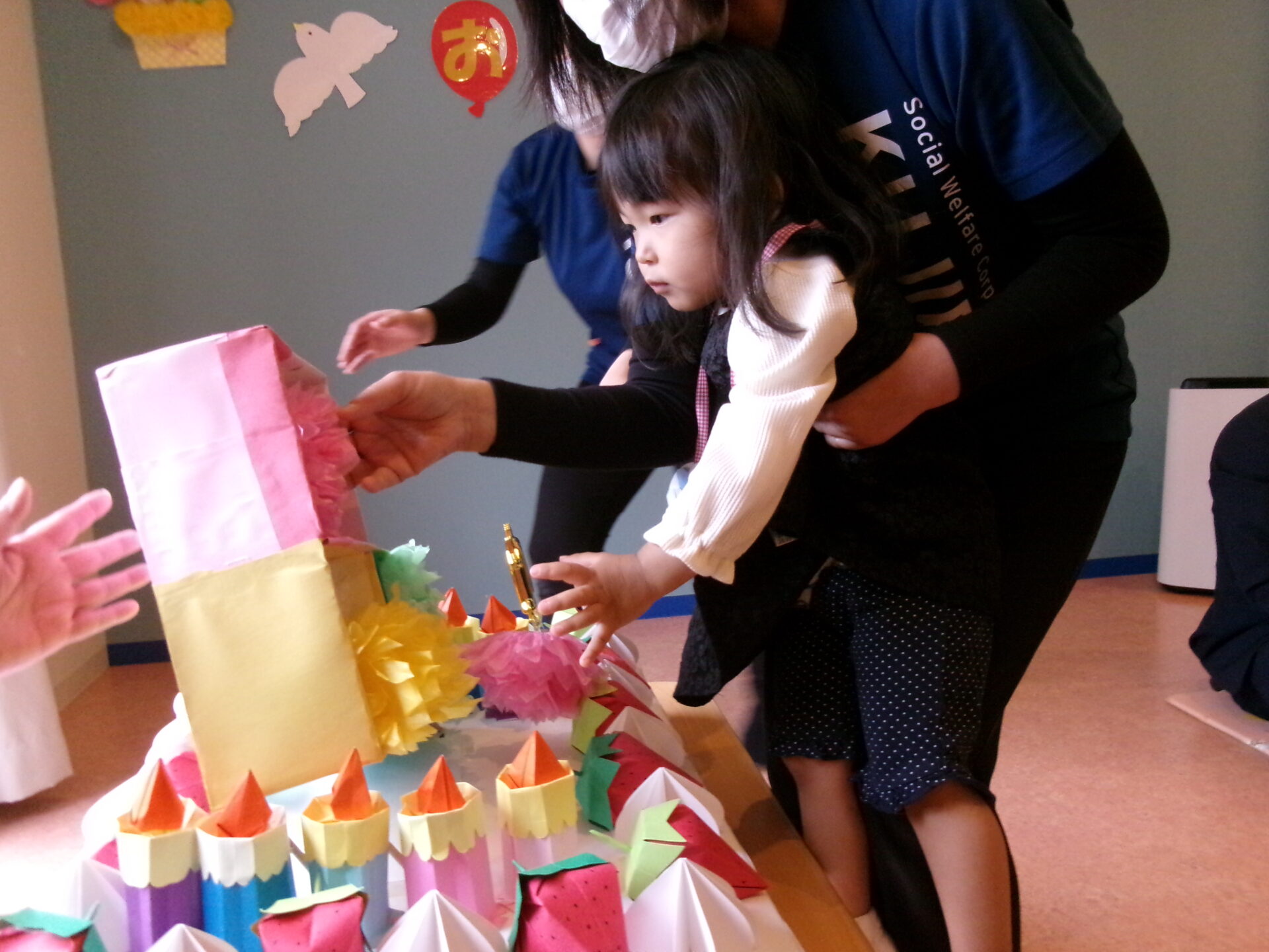 大きなケーキの法人マークに一人ひとりお花を入れてもらい、みんなの力を合わせて完成させました。