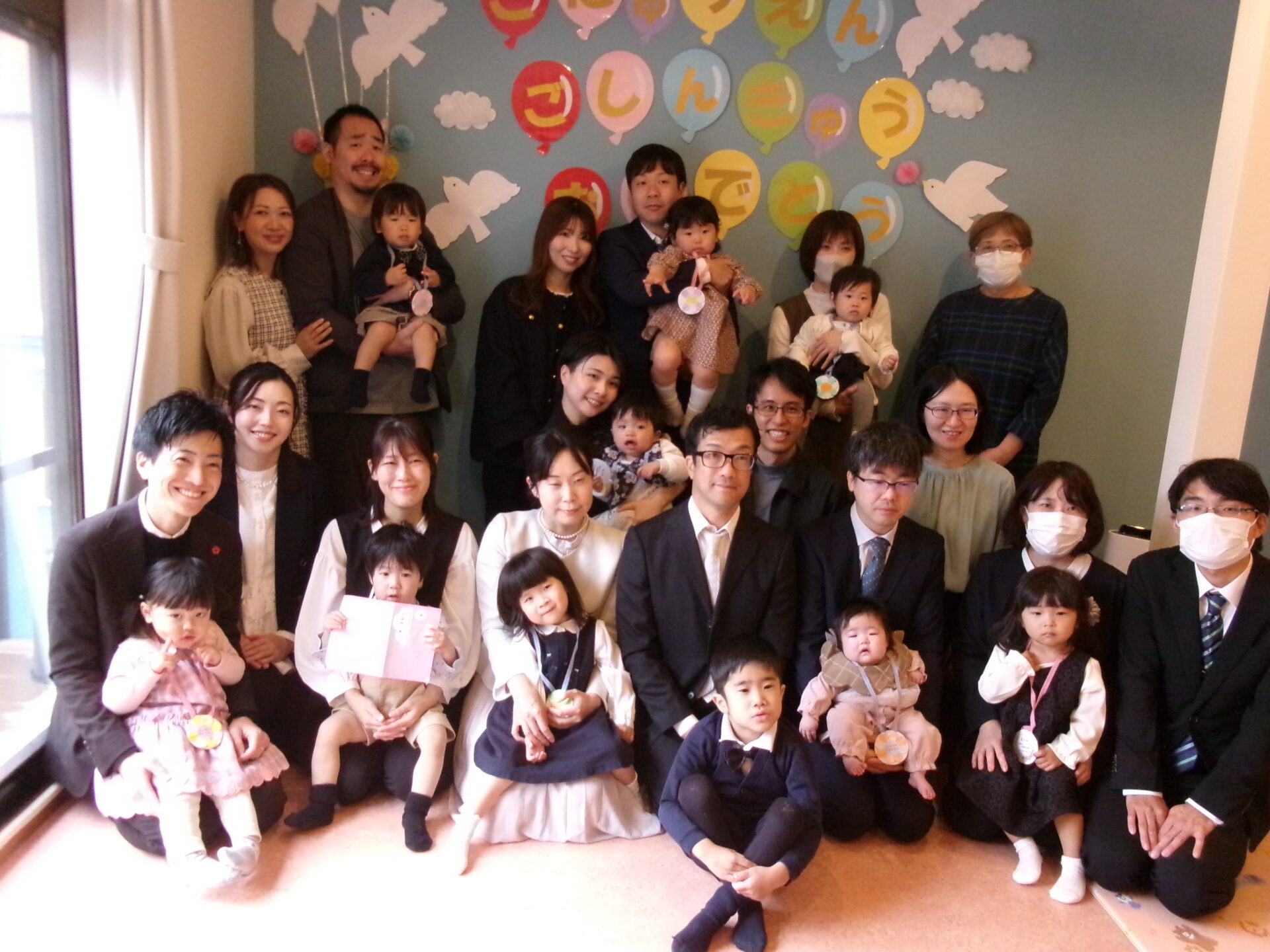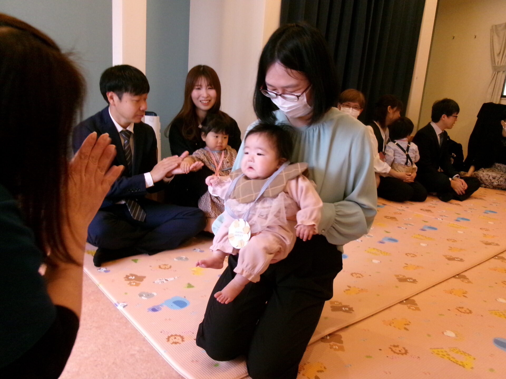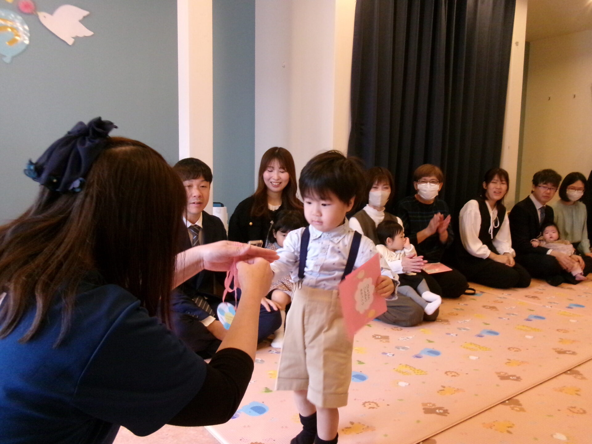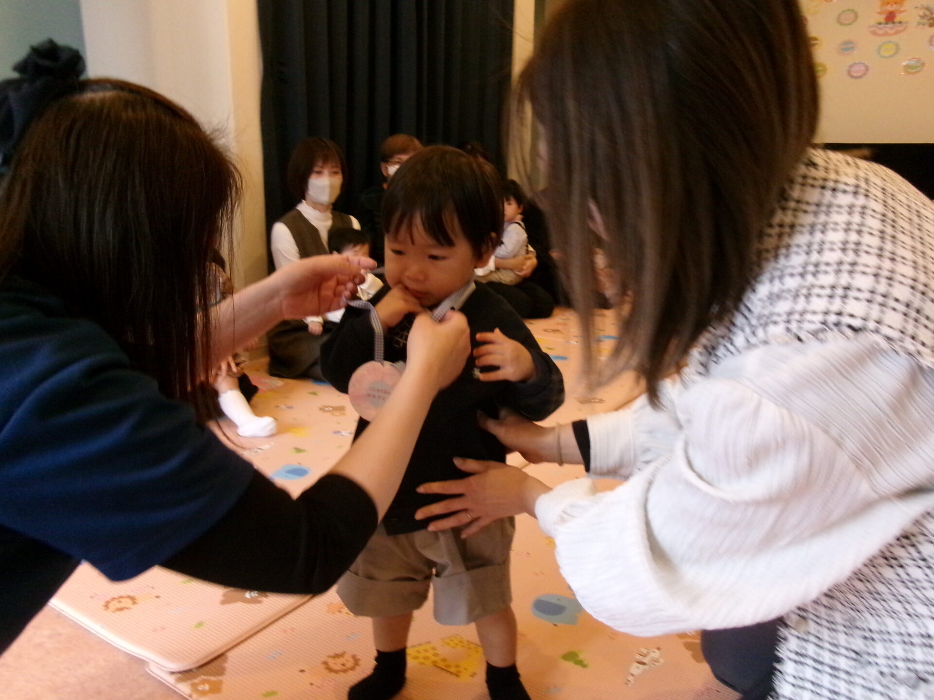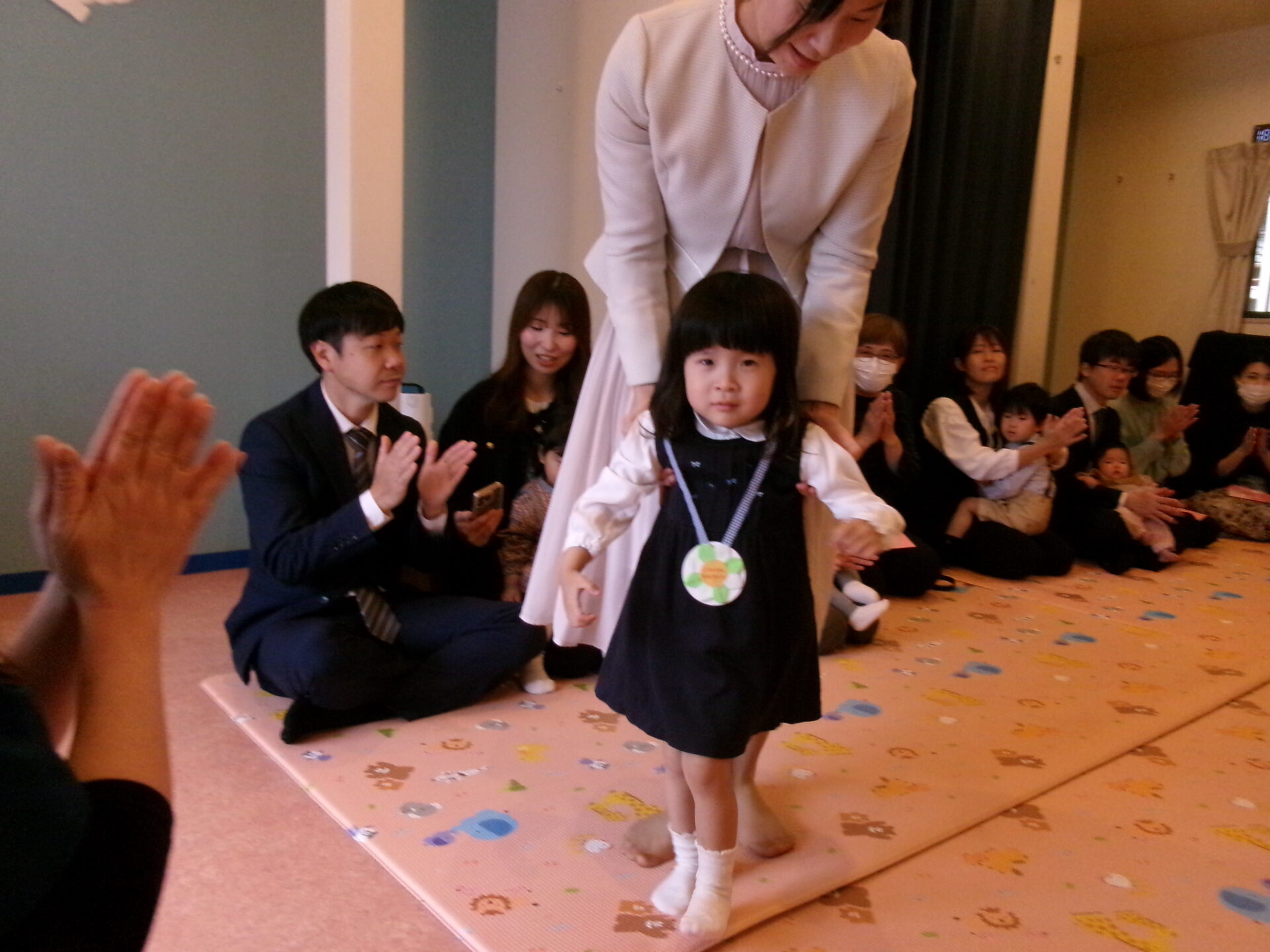 手作りメダルを園長先生から首にかけてもらうと、自然と保護者の方から拍手が起こる温かい雰囲気の中、緊張気味だった子どもたちの表情も和やかになっていきました🍀